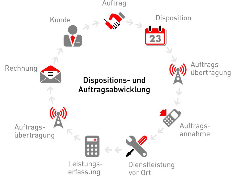 Durch die maximale Integration von Innen- und Aussendienst werden Aufträge schneller, effizienter und in hoher Qualität abgewickelt. Dieses prozessorientierte Arbeiten von der Auftragsannahme bis zur Verrechnung an den Kunden schafft entscheidende Wettbewerbsvorteile und Transparenz in jeder Phase der Auftragsabwicklung. Die Servicequalität, und dadurch die Kundenzufriedenheit, werden gesteigert.